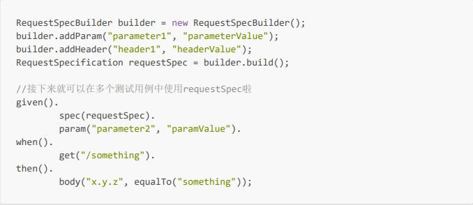 为了达到这个效果,我们可以使用RequestSpecBuilder或 ResponseSpecBuilder来实现,它们之间的区别 是,前者用在请求中,后者则用在body中。