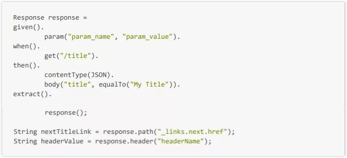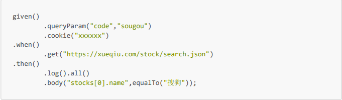 答:given用于放置需要的参数,比如上面例子中,我将访问参数:code和cookie放到了given里;when用于填 写要访问的url;then进行断言,来来判断结果是否正确。
