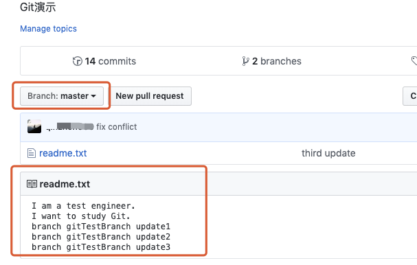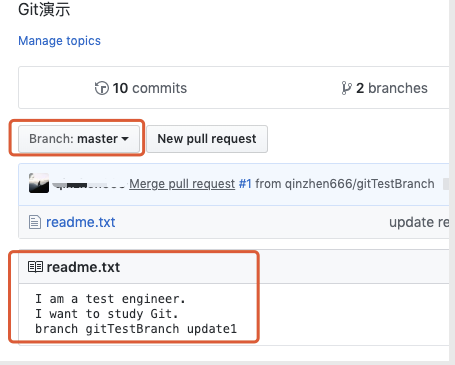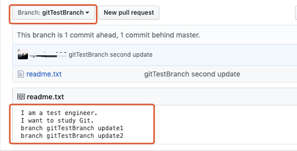 I am a test engineer.I want to study Git.branch gitTestBranch update1branch gitTestBranch update2