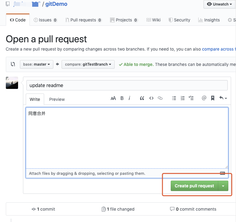 1.5)这个时候我们可以通过pr对分支进行merge: