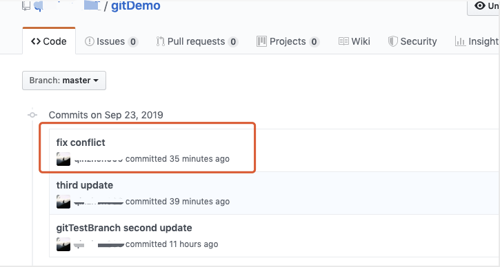 $ git checkout master$ git fetch origin gitTestBranch$ git merge origin/gitTestBranch# fix conflict$ git commit -a -m "fix conflict"$ git push