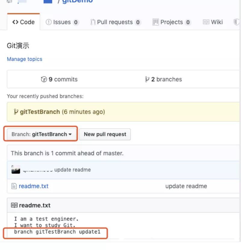 在GitHub上查看master分支和gitTestBranch分支的对比,可见gitTestBranch已成功push: