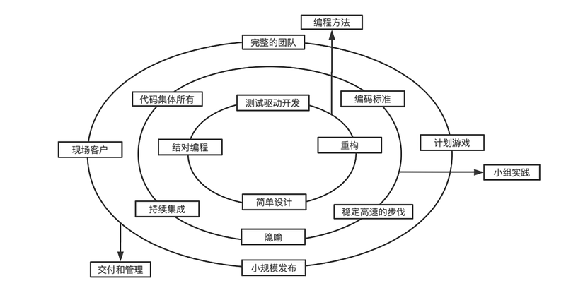 在上图中可以看出,极限编程是从 3 个维度去组织开发流程的。