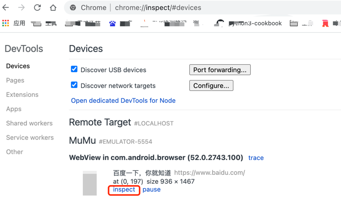 开启这个开关之后,手机端打开被测的 WebView 页面,然后在电脑端 Chrome 浏览器地址栏录入 “chrome://inspect” 将显示设备上的 WebView 列表。