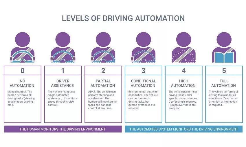 虽然我们还没有达到L4级或L5级自动驾驶汽车的水平,但我们已经很接近了。为了解释每个级别的含义,下面是一个很棒的图表: