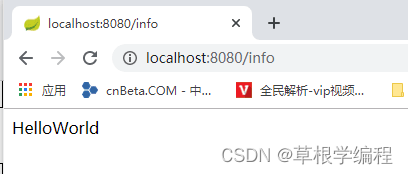 右击引导类启动(默认使⽤的8080端⼝),在浏览器输⼊localhost:8080/info即可看到结果