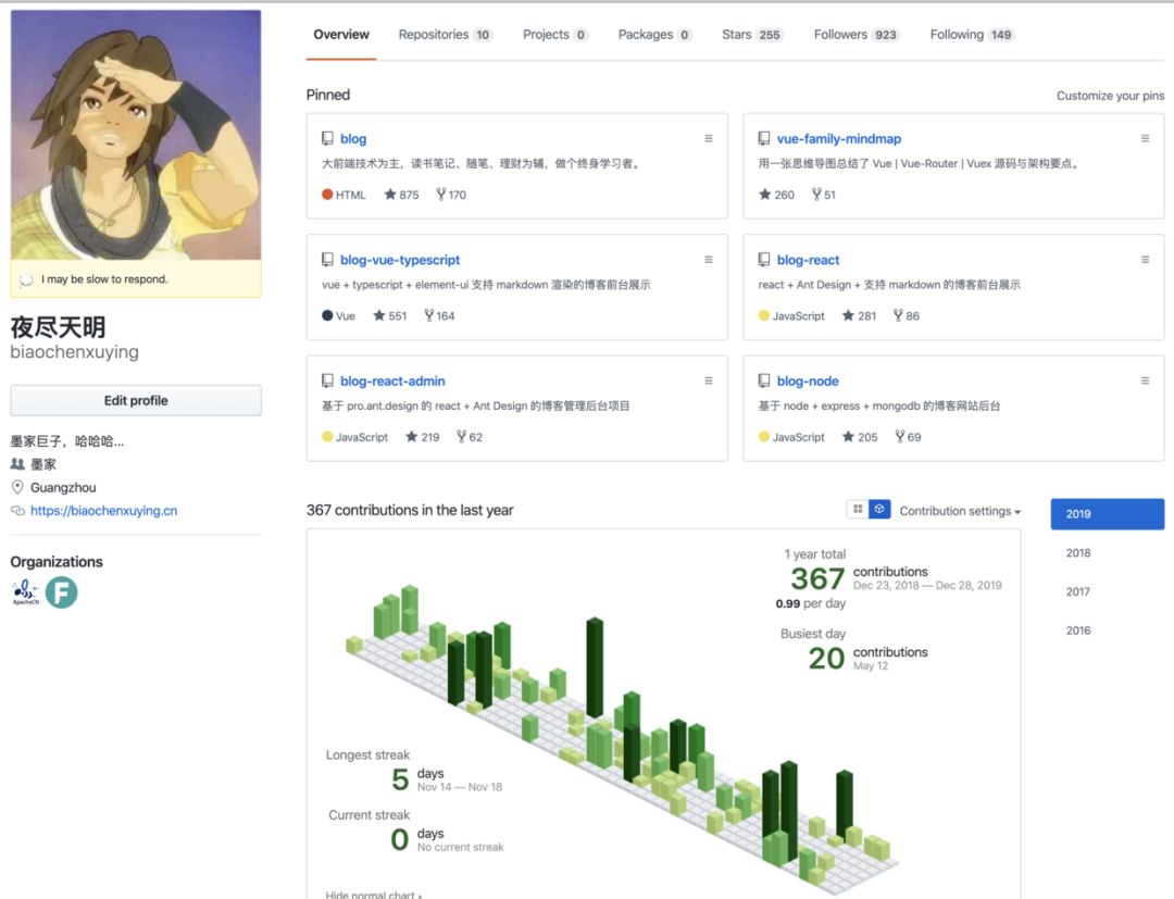 做前端这几年,今年是在 GitHub 上最活跃的一年,利用业余时间,创建和维护了 6 个开源项目,还有剩下的 4 个是 2018 年创建的。