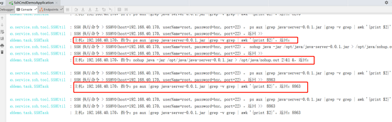 String resstartCommand = sshService.command(sshvo, startCommand);