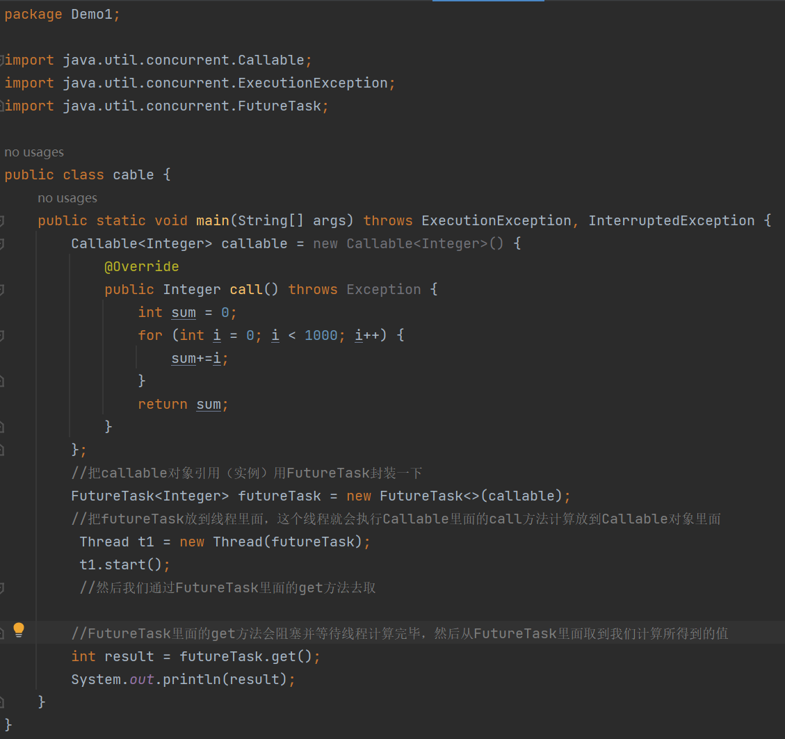 Callable通常需要搭配FutureTask取使用,我们Callable计算得到的值,需要传给在等待它的FutureTask,然后利用get()方法就能取到了。