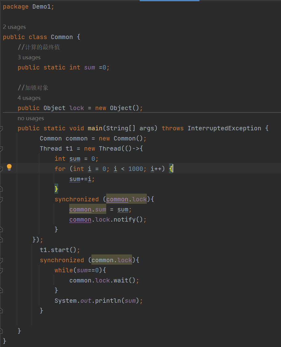 1.我们在Common这个类里面定义一个静态变量sum=0;同时定一个一个锁对象()不同线程锁对象是同一个才会发生锁竞争。