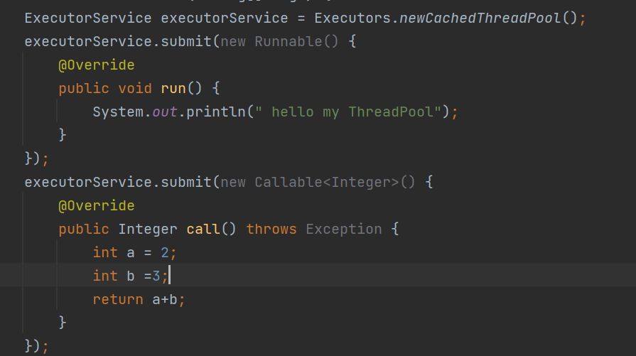 代码实例:(上面是一个利用Runnable实现的线程,下面是一个用Callable接口实现的线程这个俩个线程的区别看上面就行)