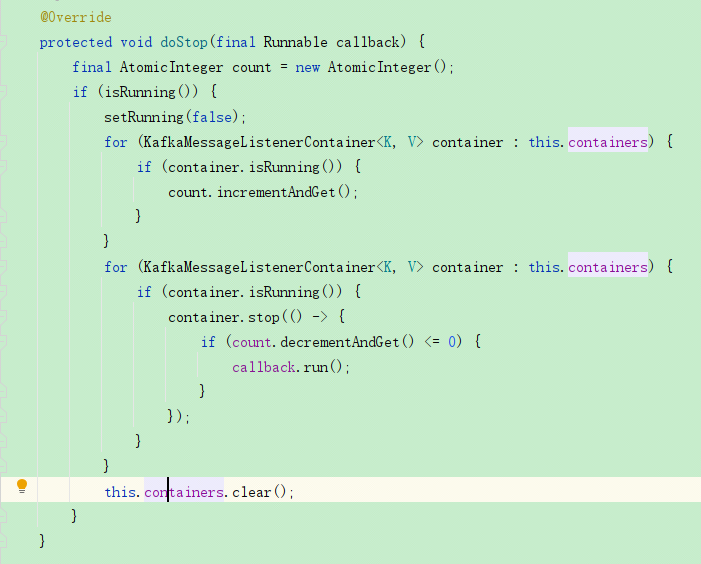 stop与pause不一样,这个是停止消费,是将消费者的container直接移除,相当于在kafka那将该消费者移除了,是会触发kafka的rebalance的。