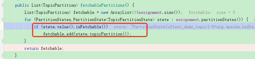 然后在kafka消费线程进行拉取消息的时候会判断该标志位,如果是暂停的话,就会针对消费者对应的分区不做处理:就是在创建请求的时候不会对分区做请求,以此来达到暂停消费的效果。