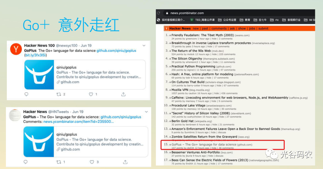 而在其他领域的扩展上,C 语言在 10 年之后出现了“C with class”的 C++,而 Go 语言也出现了面向数据科学领域的 Go+,在互联网上带来了非常大的反响: