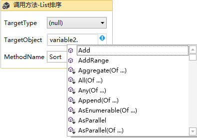 编辑区拖入InvokeMethod,设置TargetType属性为System.Array,MethodName的方法为Sort,然后在Parameters的属性输入数组变量variable1: