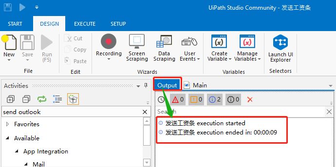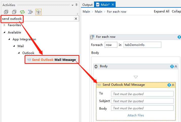 Body的"Drop activity here"处拖拽个“Send Outlook Mail Message”activity: