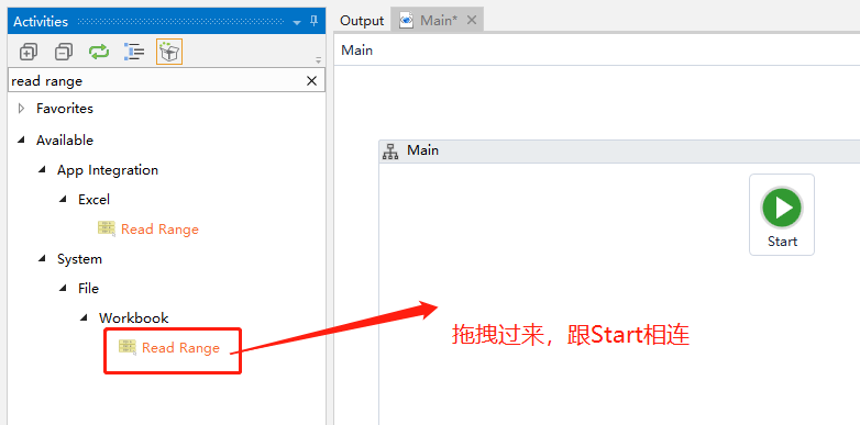 UiPath自动帮你把Start和Read range连接了起来,祝贺你,你跨出了RPA之旅的第一步。
