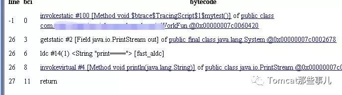 该方法就所做的就是我们在Trace脚本里定义的内容,比如上面,我们会在对应java方法执行时打印一行等号,其对应的方法jvm指令如下: