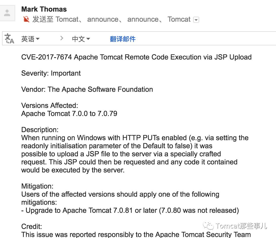 到 Tomcat 的mail-list里查看邮件,果然邮件组里官方已经发布公告。