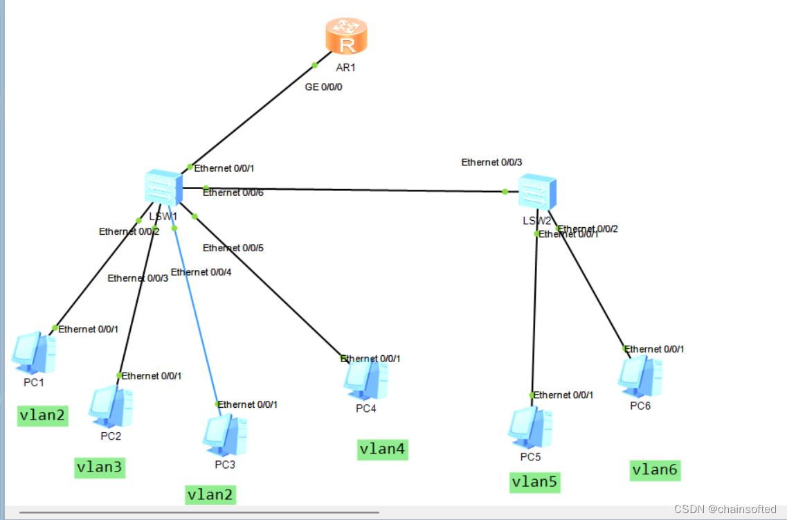 [SW1-Ethernet0/0/6]port trunk allow-pass vlan 2 to 6