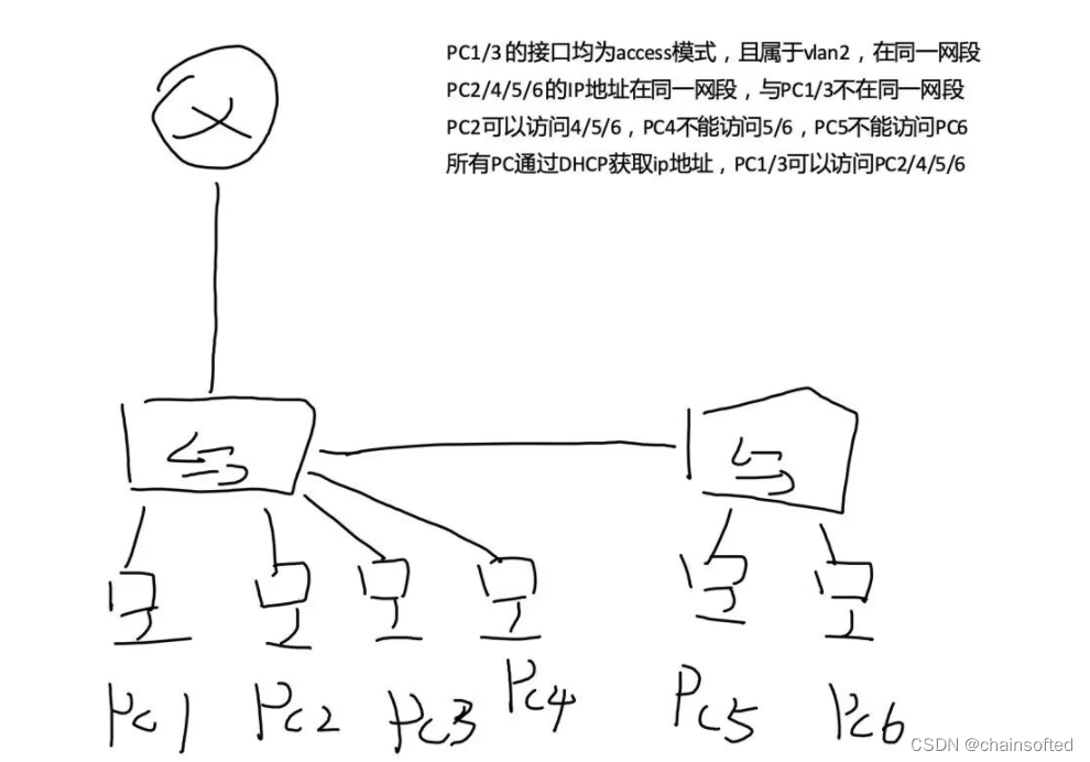 PC2访问4 5 6,PC4不能访问5 6,PC5不能访问PC6,PC1和3可以访问2 4 5 6
