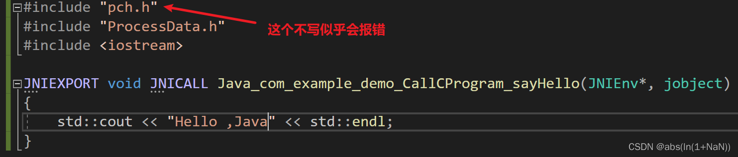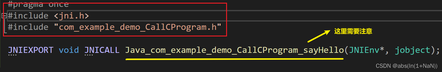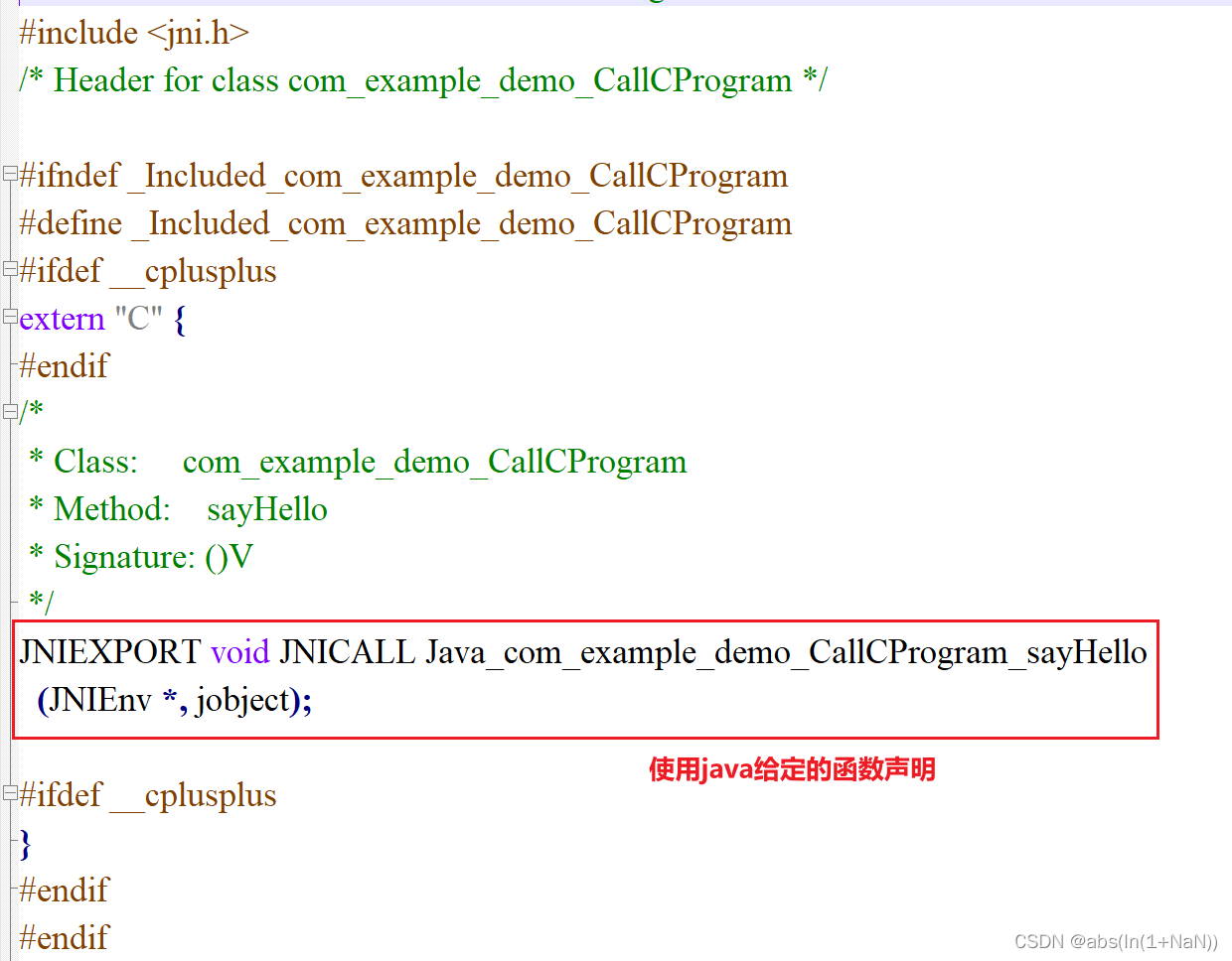 需要注意的是,函数声明已经由java帮我们制定了,我们打开第一步生成的 .h 文件