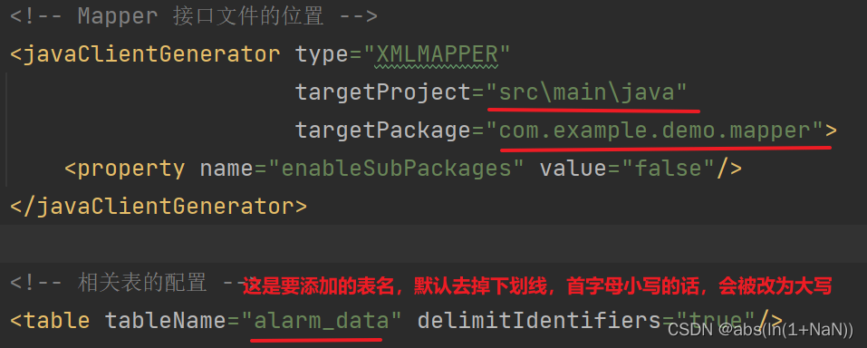 <table tableName="alarm_data" delimitIdentifiers="true"/>