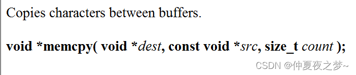 - 不适合用于处理内存重叠的情况。举个例子,将源地址的第1 ~ 4个字节拷贝到源地址的第3 ~ 6的字节位置上,此时发生了内存重叠。(如果有内存重叠,则需要使用memmove函数)