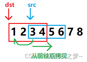 如果源地址在目的地址的右边,那么这个时候,就应该是从前往后拷贝。这个时候就相当于是把蓝色框里的内容向前移动了一样,最先移动的是最左边的内容。
