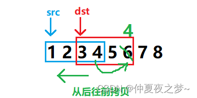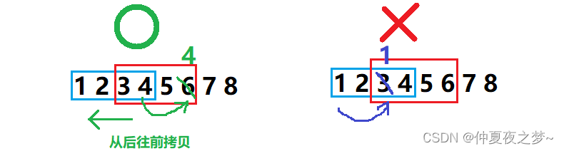 如果 边,应该是从后往前拷贝。这个时候相当于是把蓝色框里的内容向后移动了一样,最先移动的是最右边的内容。