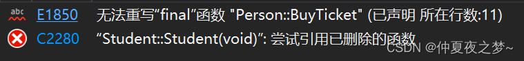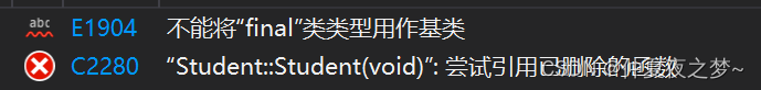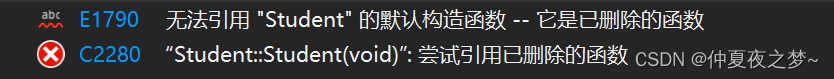 需要知道的是一旦显式定义了构造函数,那么构造函数就不会自动生成。我们创建 Student 对象的时候,子类需要通过构造函数初始化 父类成员 和 子类成员,此时会先调用父类的默认构造函数,但是父类没有默认构造,而且也不会自动生成,所以就会报错。