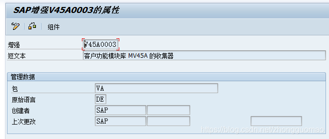 <4>保存所输入的组件对象后,单击维护页面中的“组件”按钮,系统进入到组件列表页面。该页面中将列出组件所包含的功能函数,如组件对象“V45A0003”包含了“EXIT_SAPMV45A_003”和“EXIT_SAPMV45A_004”两个功能函数,若同时维护了多个组件对象,则会在该页面中将所有的函数对象按顺序列出来。