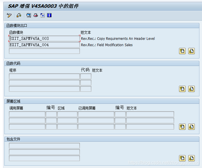 需要注意的是,一个函数只会对应一个出口,但是一个出口对应可以对应多个函数,如“V45A0003”可以同时对应“EXIT_SAPMV45A_003”和“EXIT_SAPMV45A_004”两个函数。