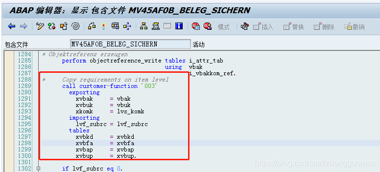 基于函数的出口在程序中通过引用代码“CALL CUSTOMER-FUNCTION <3位数字>”来调用,以VA01的主程序SAPMV45A为例,在程序中查找包含“CALL CUSTOMER-FUNCTION”的字符串,可以找到例如代码“ call customer-function '003'”,具体如下图所示: