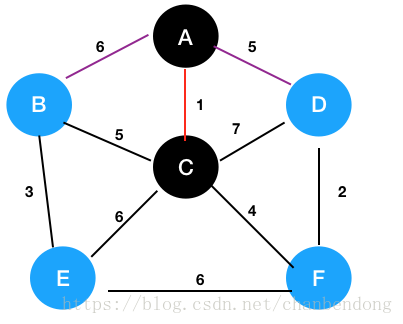 接下来,把黑点与蓝点相连的线都涂成紫色,与两个黑点相连的蓝点取权值小的作为紫线