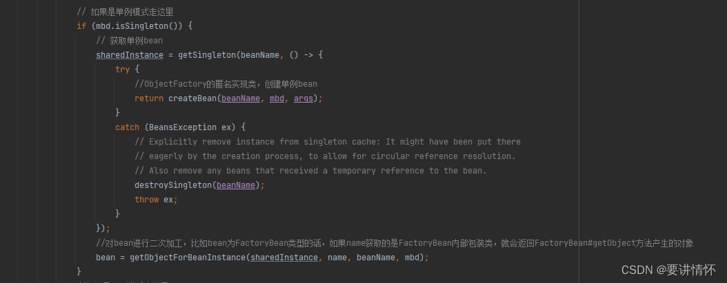 因为我们主要关注spring的IOC,所以只需要关注bean的作用域为singleton的即可。那么我们只需要看这一块代码即可