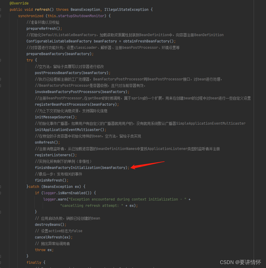 关键代码都加上注释了,可以简单了解下,重点在beanFactory.preInstantiateSingletons(),进入该方法看下具体实现: