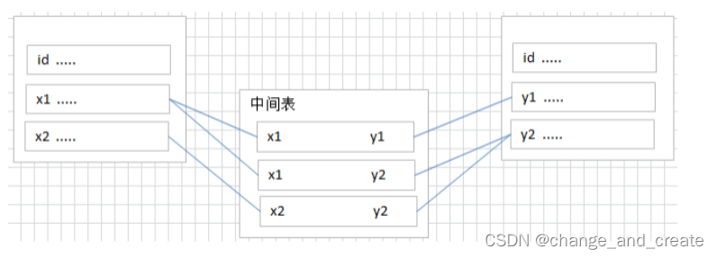 - 多对多关联:多对多关联需要一个中间表(即联接表),两张表分别和中间表形成一对多关系,那么这两张表就构成多对多关系