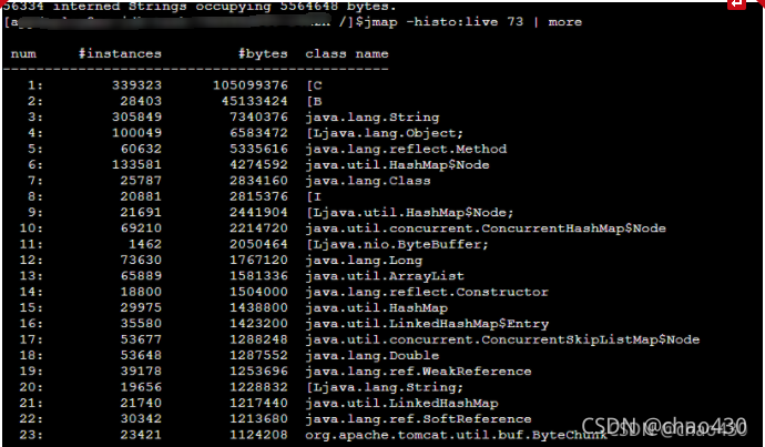使用jmap -histo[:live] pid查看堆内存中的对象数目、大小统计直方图,如果带上live则只统计活对象,如下: