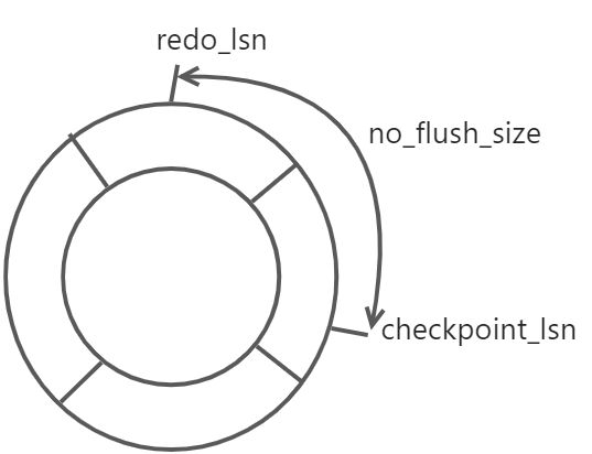 如图最新写入的重做日志位置标记redo_lsn,刷新回磁盘最新页的位置标记checkpoint_lsn。redo_lsn和checkpoint_lsn之间是未刷新到磁盘的重做日志,no_flush_size称为未刷新磁盘重做日志容量。