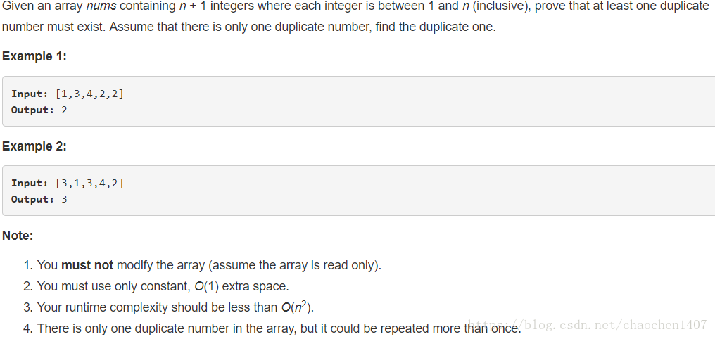 之所以会产生这种情况是因为这样转换成一个链表的形式的时候,因为有duplicate number,所以最后肯定会产生的情况是某个index对应的节点有不少于两个别的节点指向它,所以最后必然会形成一个环。这就是这种链表模拟做法能够成立的原因。