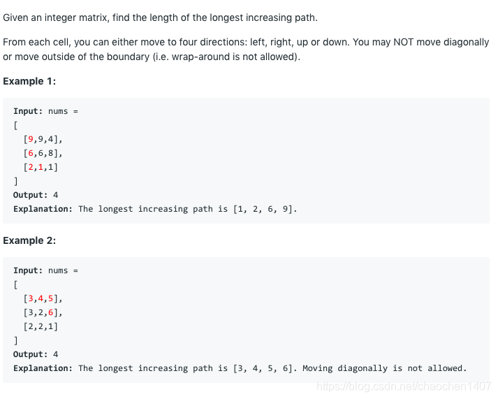 之所以result可以一方面的作为result的cache,另一方面的作为dfs的遍历过的点的记录的原因是因为这一题本身的特质就可以防止dfs走回头路(因为是longest increasing,所以要走的点一定比自己大,走过的点一定比自己小)。