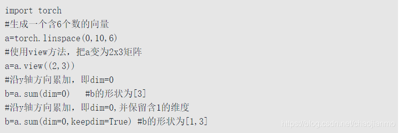 归并操作一般涉及一个dim参数,指定沿哪个维进行归并。另一个参数是keepdim,说明输出结果中是否保留维度1,缺省情况是False,即不保留。