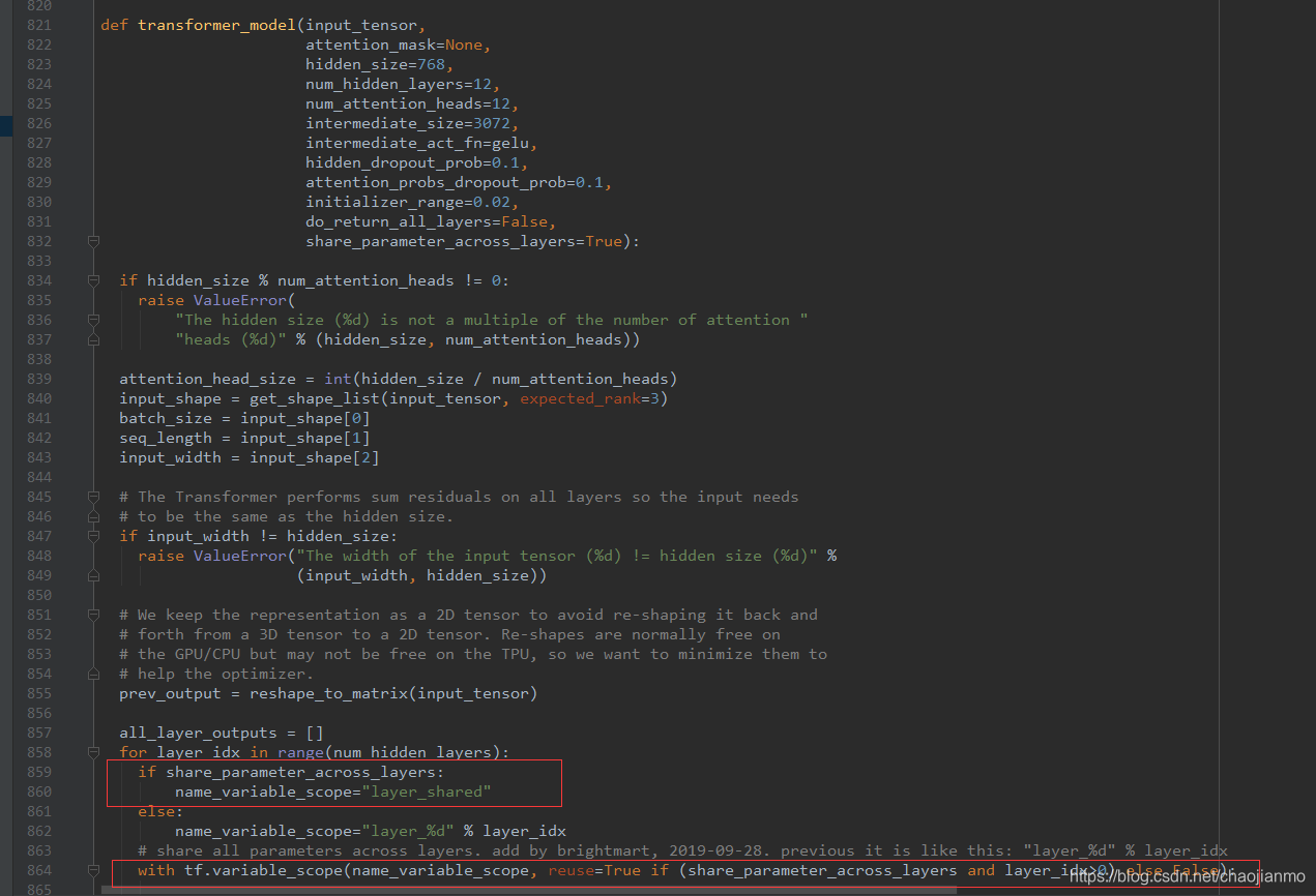 modeling.py中,在variable_scope中设置reuse=True实现跨层共享参数。