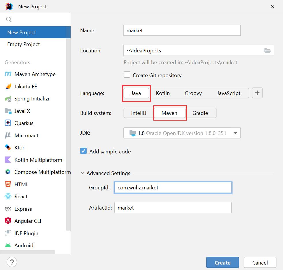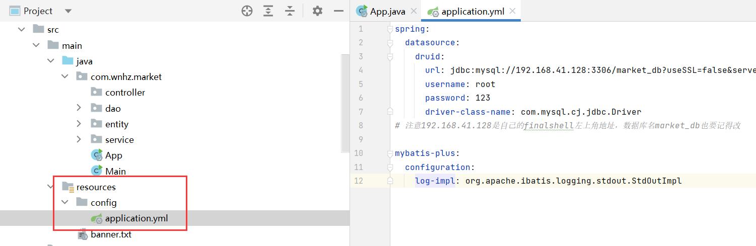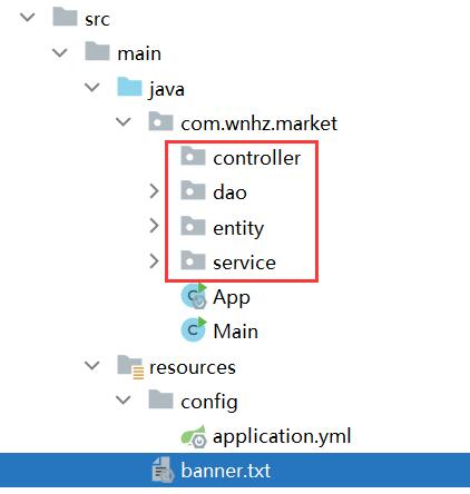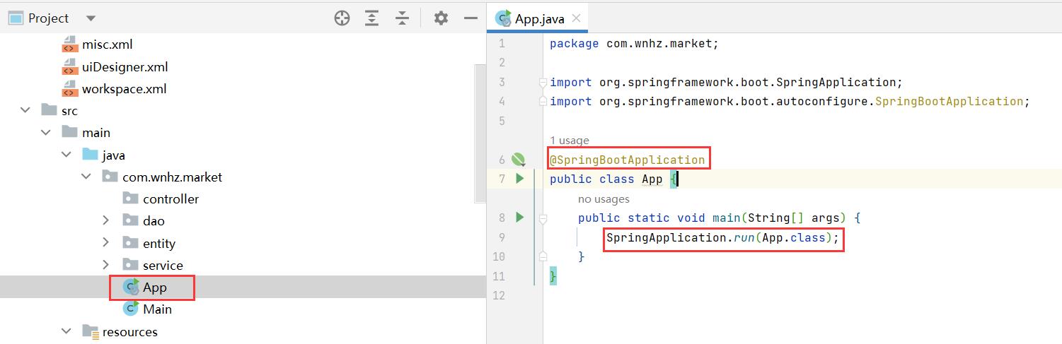 - 在com.wnhz.market下新建App.java文件,之后添加注解@SpringBootApplication,写入main方法,添加SpringApplication.run(App.class);