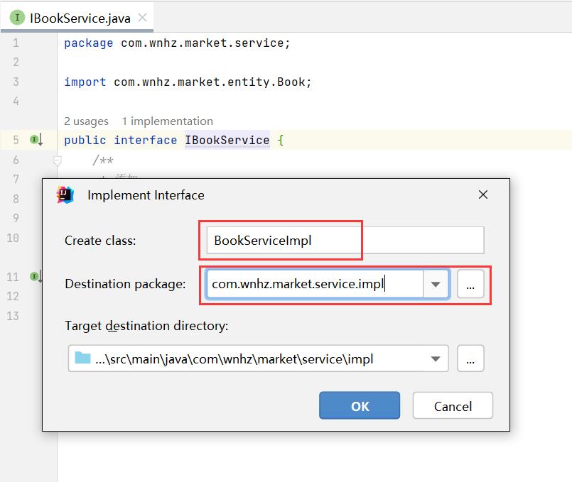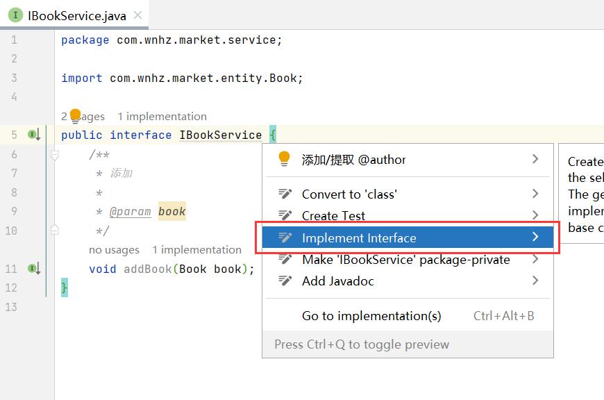- 在IBookService文件中,鼠标放在public interface IBookService上面,按快捷键alt+enter,选择Implement Interface自动生成接口实现文件,注意是否要改名和文件存放位置