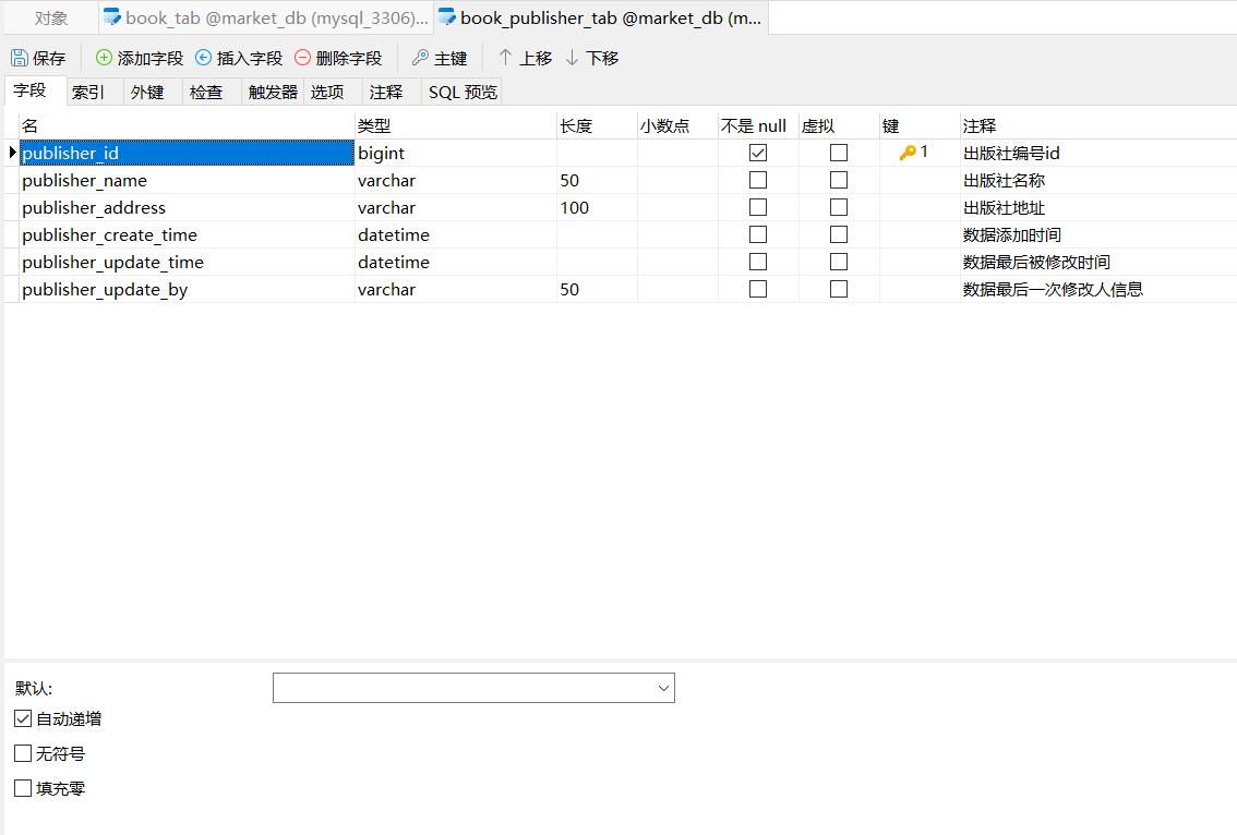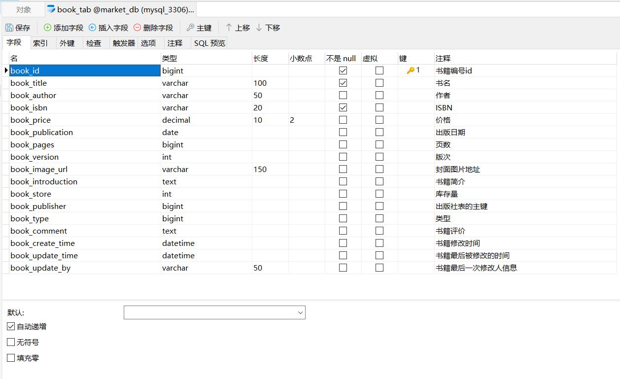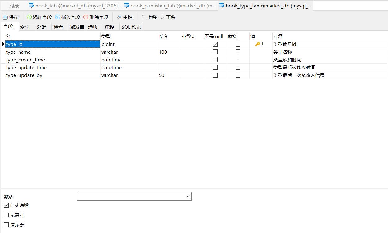 - 本项目为网上电商销售图书项目,可参考当当网上购书商城,暂时先新建三张表,分别为书籍信息表、出版社表和书籍类型表,具体设计表信息如下所示:
