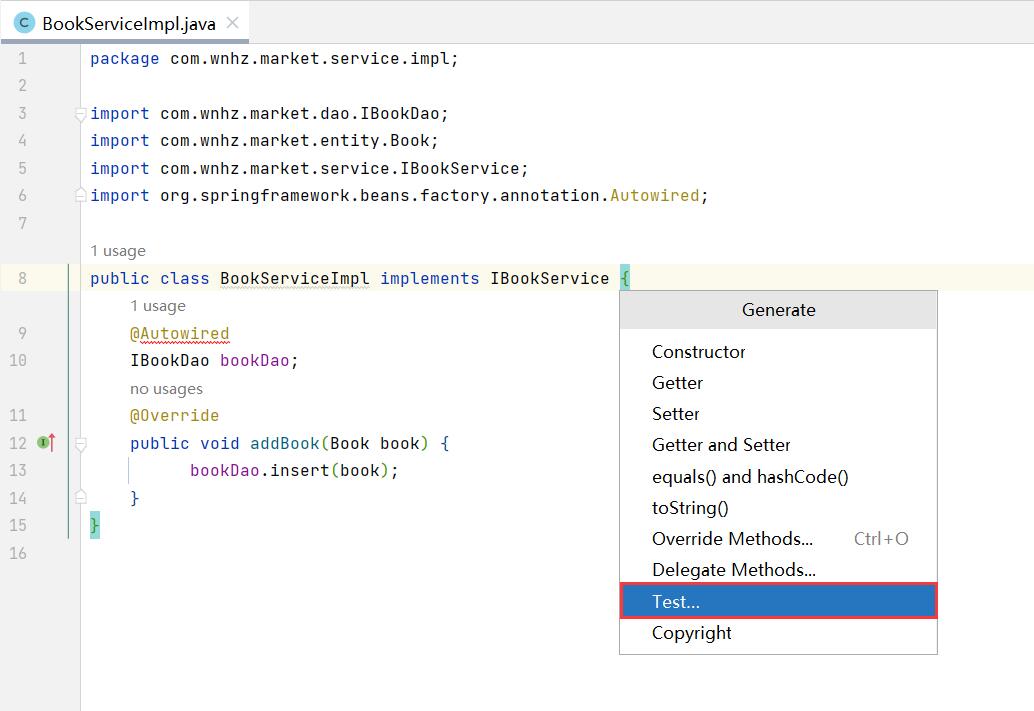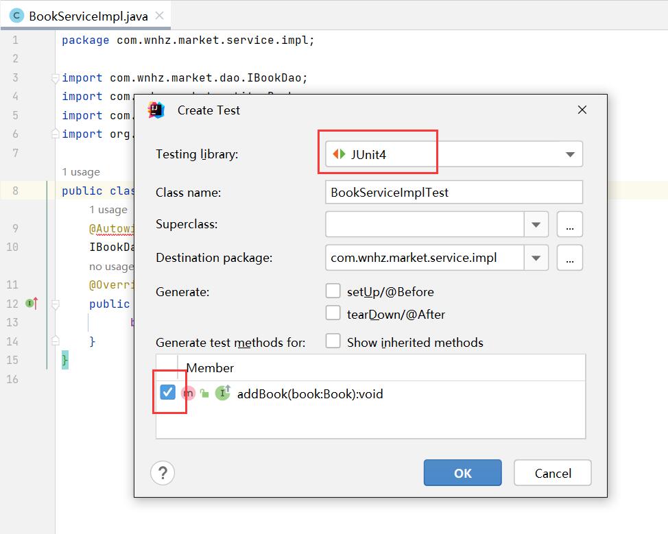 - 在BookServiceImpl使用快捷键alt+insert,再选择test,注意选择JUnit4自动生成单元测试文件,注意添加注解@SpringBootTest、@RunWith(SpringJUnit4ClassRunner.class)、@Test