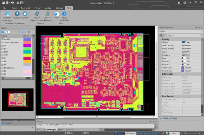 GerbView查看器允许用户可以使用一个包含任何支持的文件格式的一个或多个文件(层)的工作区,可以保存工作区以备后用,工作区将引用用户的设计文件,因此只需重新加载工作区即可查看整个设计,用户可以将此工作区的大小设置为预选的纸张大小之一,或自定义大小,使用精确的测量工具来验证距离和面积。使用查询和光圈高亮工具检查轨道和闪光灯使用的光圈,可以将文本、条形码、二维码、图像、箭头、线条、符号、椭圆和多边形等标记元素添加到工作区,并将在转换和打印过程中包含在内,所有类型的标记元素,例如文本或条形码,都可以“烧入”成为 Gerber 层的永久部分,用户可以使用自定义比例打印文件,例如原始比例为百分百或使用适合页面,打印海报模式,也称为平铺页面,可用于在多张纸上打印大型设计和绘图,页眉、页脚和水印信息可以选择性地添加到打印的纸张上。