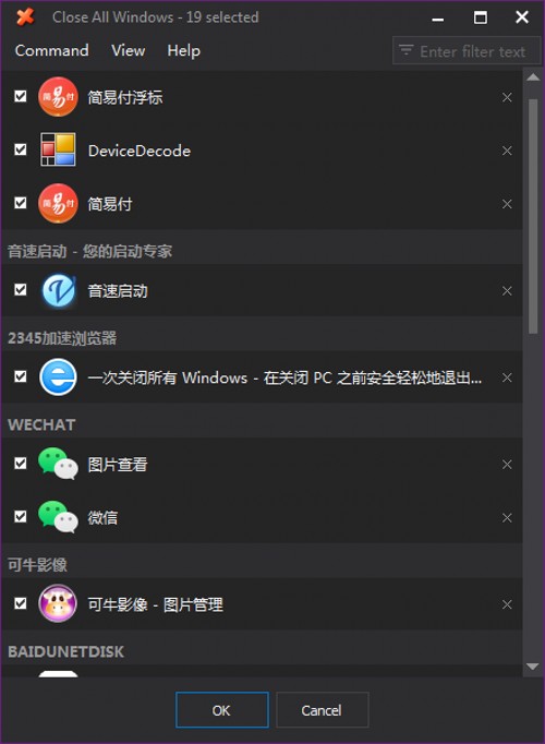 Close All Windows 是一款加强版终极Windows任务管理器软件,专为快速关闭多个应用程序而设计,允许用户非常方便且快捷高效的批量关闭多达数十个正在运行中的Windows应用程序,允许用户为任务列表选择不同的排序和分组选项,双击组以选择/取消选择整个组,通过输入窗口标题或应用程序名称的任何部分来过滤应用程序,并使用单独的关闭按钮逐个关闭运行中的应用程序,大大提升Windows系统关机所需的时间,规避因运行中的程序没有及时退出导致的假死或关机延迟等问题,想知道关机时间太长怎么解决吗,威航软件园推荐大家试试Close All Windows吧,使用简单且非常实用,同时资源占用也是微乎其微,建议有关机延迟问题需要优化的亲们使用。